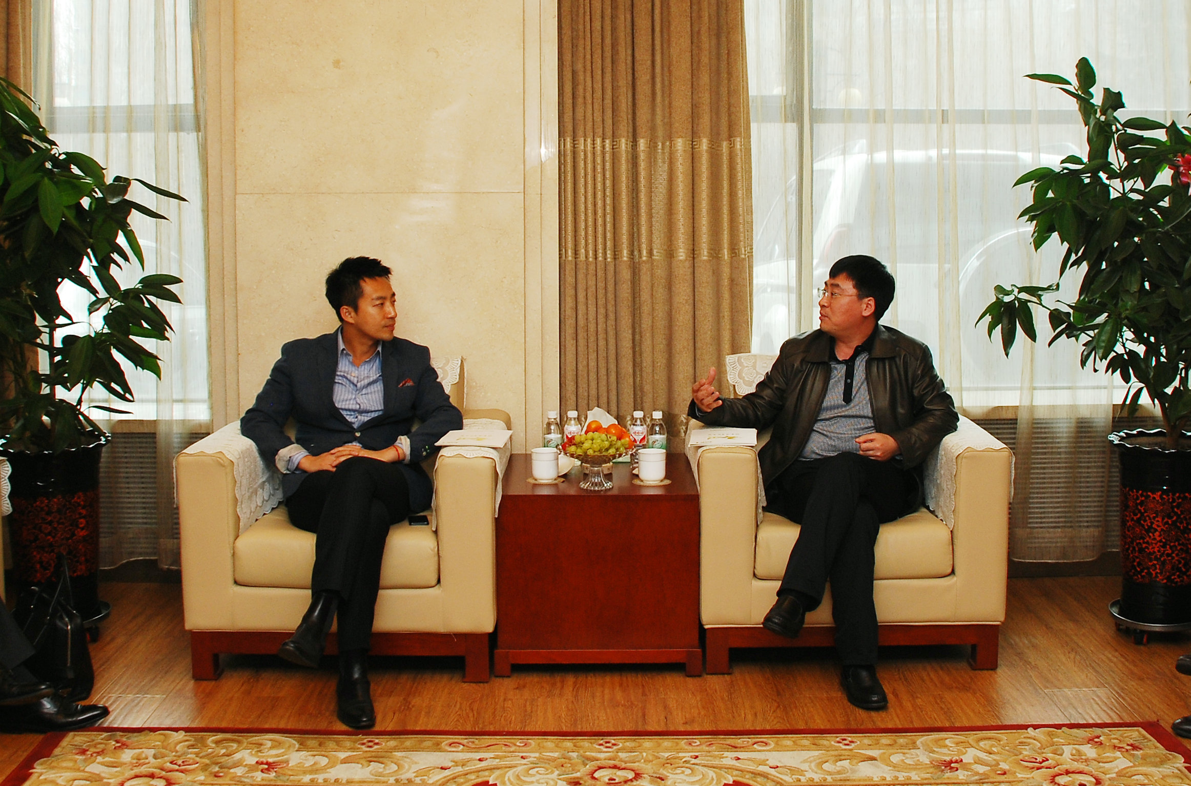 圖為:4月24日,北大荒米業(yè)董事長修孝軍(右)向俏江南投資有限公司CEO董事汪小菲商談合作事宜。