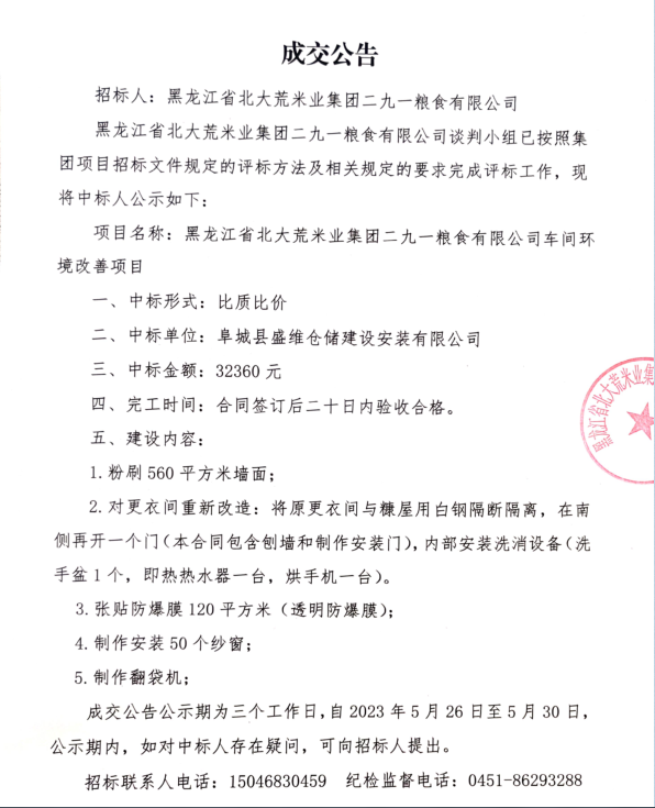黑龍江省北大荒米業(yè)集團二九一糧食有限公司車間環(huán)境改善項目成交公告