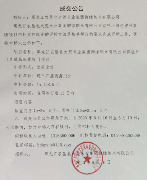 北大荒米業(yè)御綠公司保溫外門及成品庫卷簾門成交公告