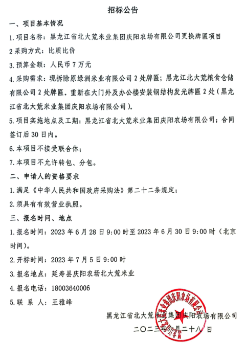 黑龍江省北大荒米業(yè)集團(tuán)慶陽農(nóng)場(chǎng)有限公司更換牌匾項(xiàng)目招標(biāo)公告