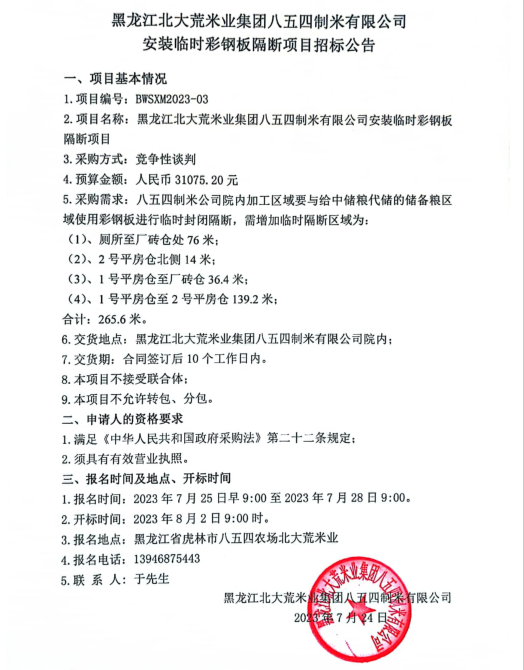 黑龍江省北大荒米業(yè)集團八五四制米廠有限公司安裝臨時彩鋼板隔斷項目招標(biāo)公告