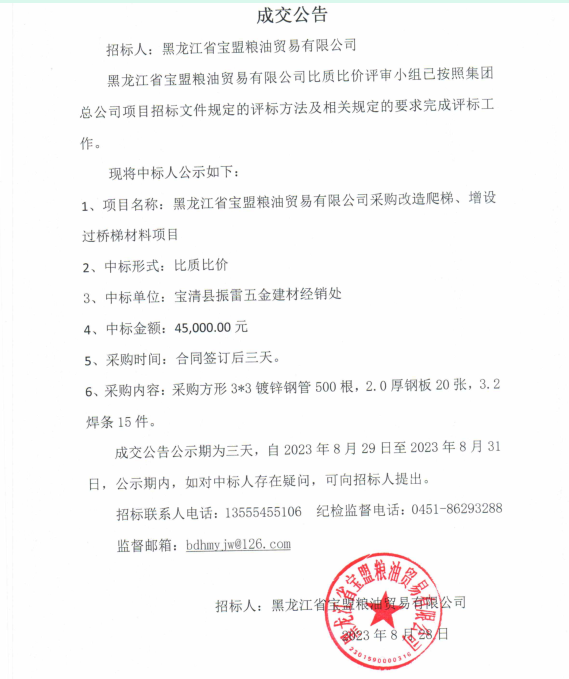 黑龍江省寶盟糧油貿(mào)易有限公司采購改造爬梯、增設過橋梯材料項目中標公告