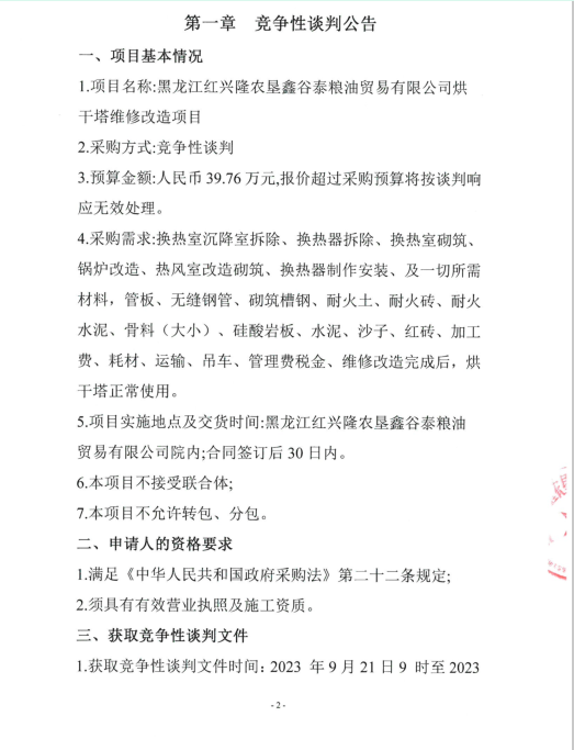 黑龍江紅興隆農墾鑫谷泰糧油貿易有限公司烘干塔維修改造項目競爭性談判公告