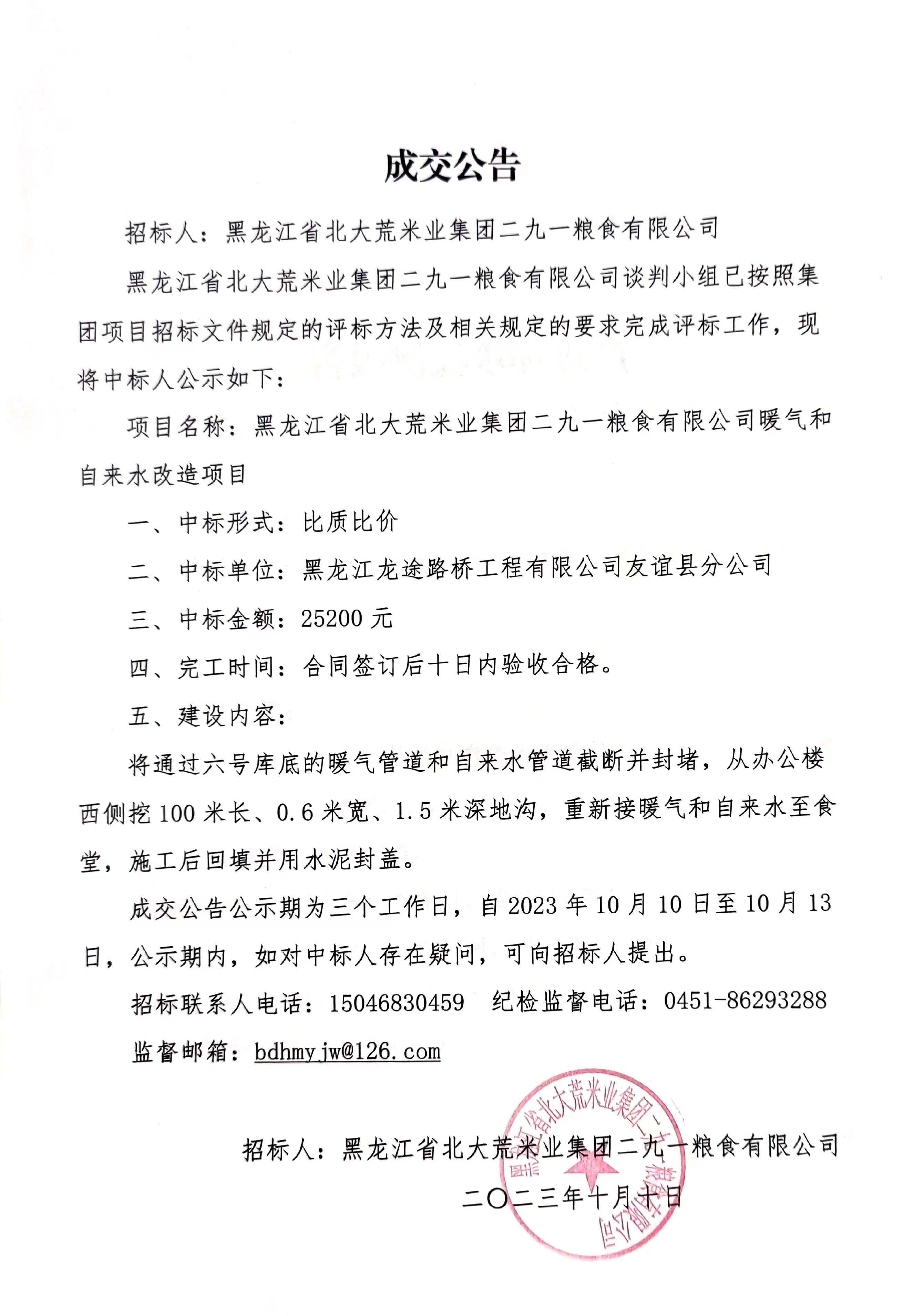 黑龍江省北大荒米業(yè)集團二九一糧食有限公司暖氣和自來水改造項目成交公告