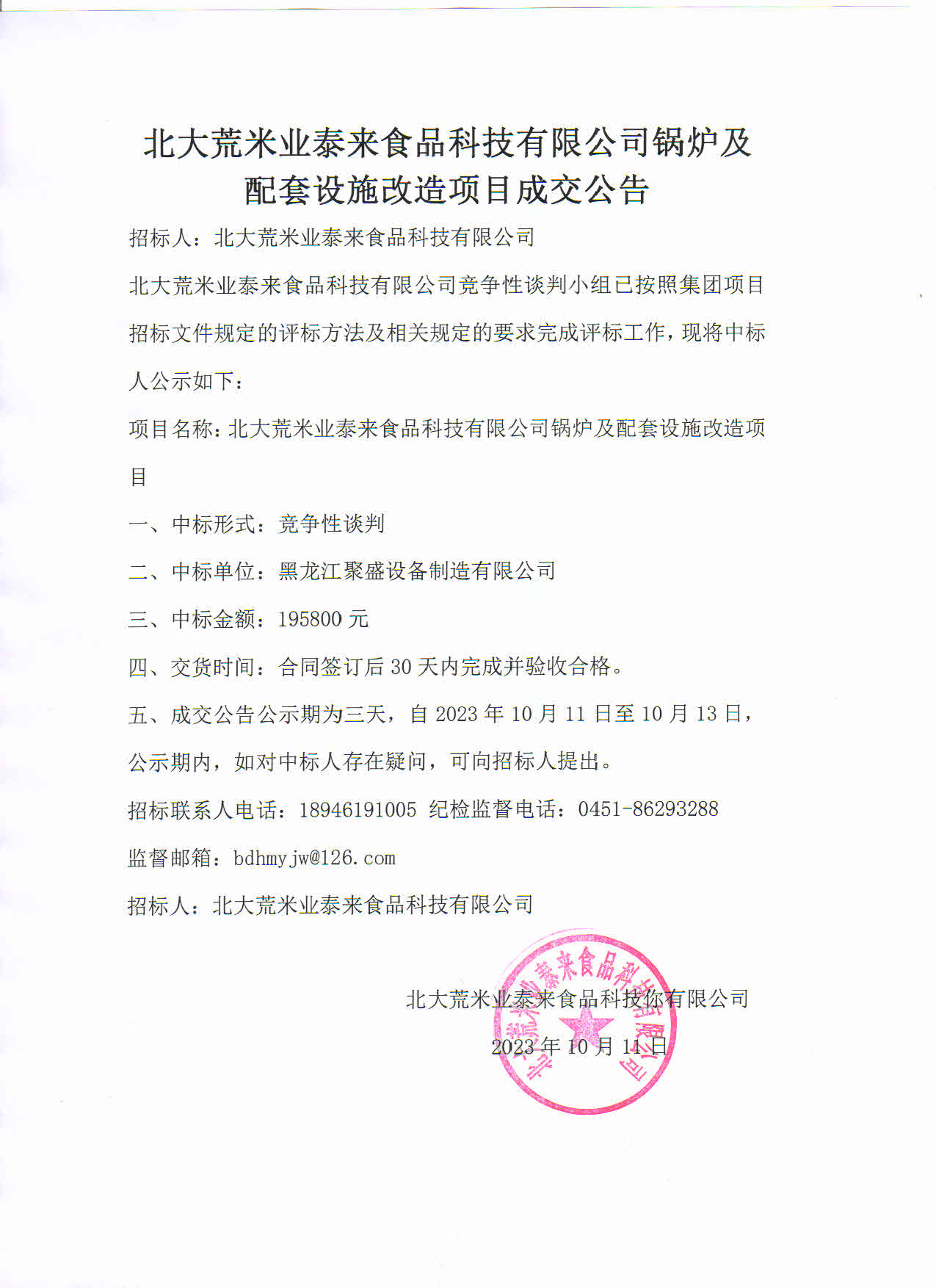 北大荒米業(yè)泰來食品科技有限公司鍋爐及配套設(shè)施改造項目成交公告