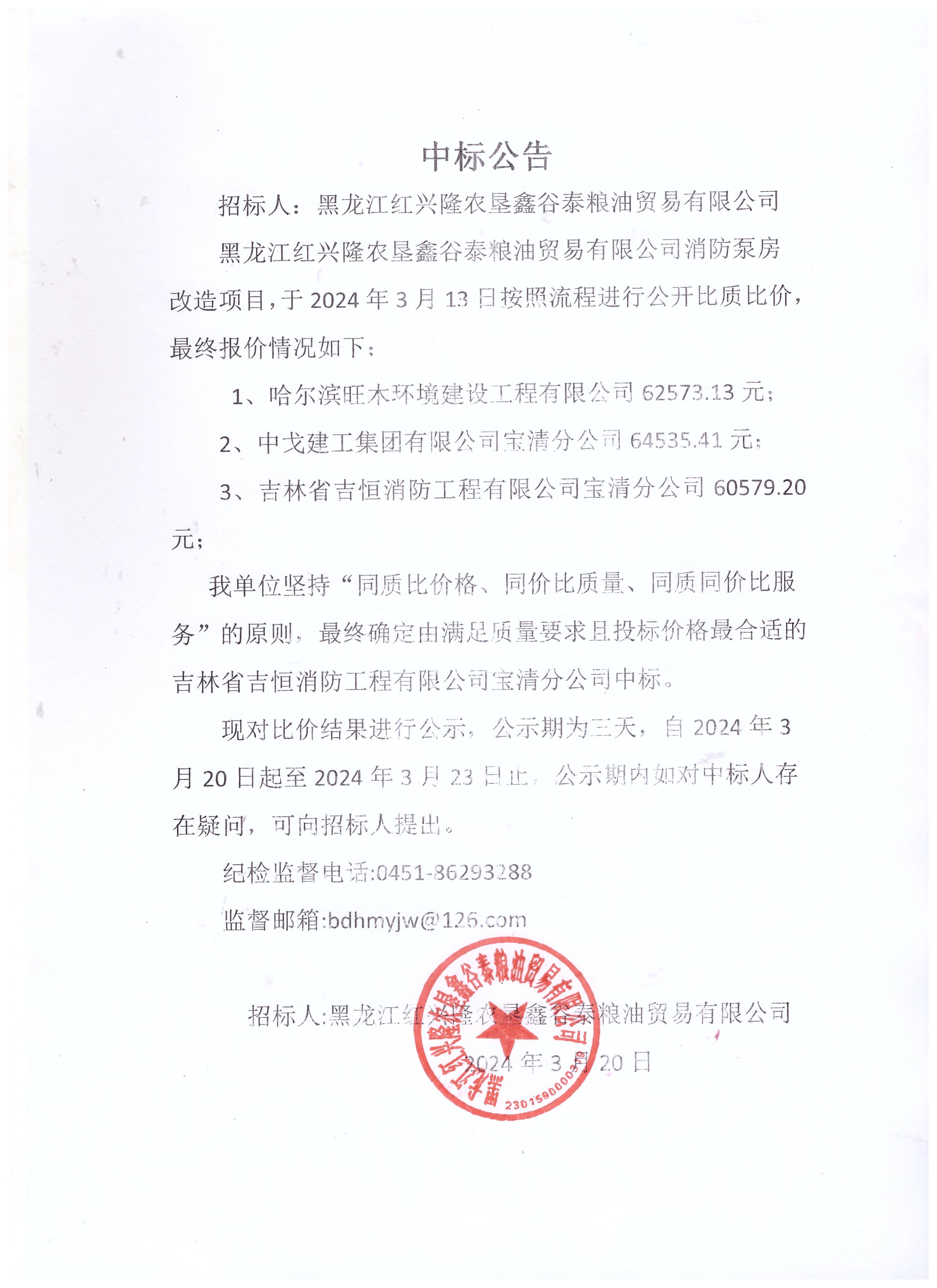 黑龍江紅興隆農(nóng)墾鑫谷泰糧油貿(mào)易有限公司消防泵房改造項目中標(biāo)公告