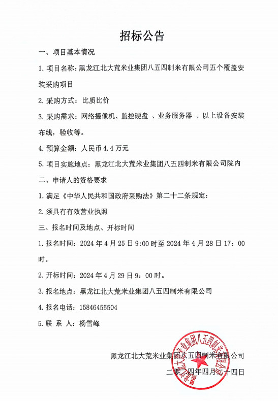 北大荒米業(yè)854制米公司五個覆蓋安裝采購項目招標公告