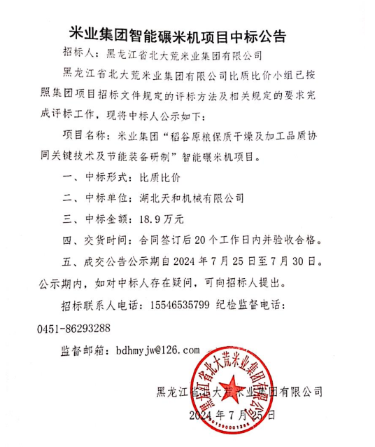 米業(yè)集團“稻谷原糧保質(zhì)干燥及加工品質(zhì)協(xié)同關(guān)鍵技術(shù)及節(jié)能裝備研制”智能碾米機項目中標(biāo)公告