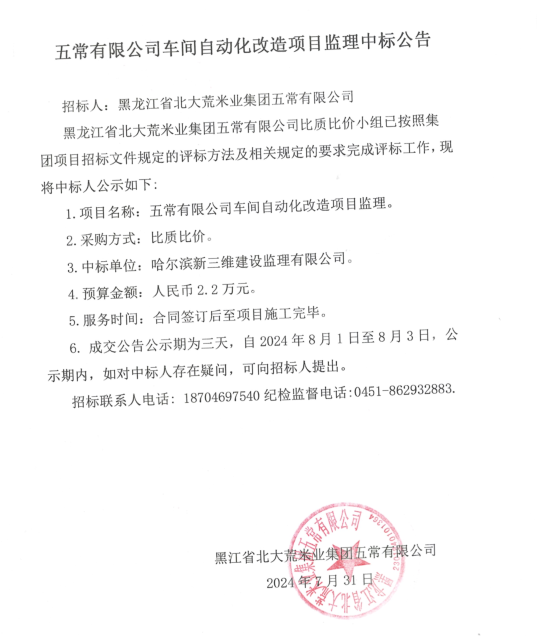 五常有限公司車間自動化改造項目監(jiān)理中標公告