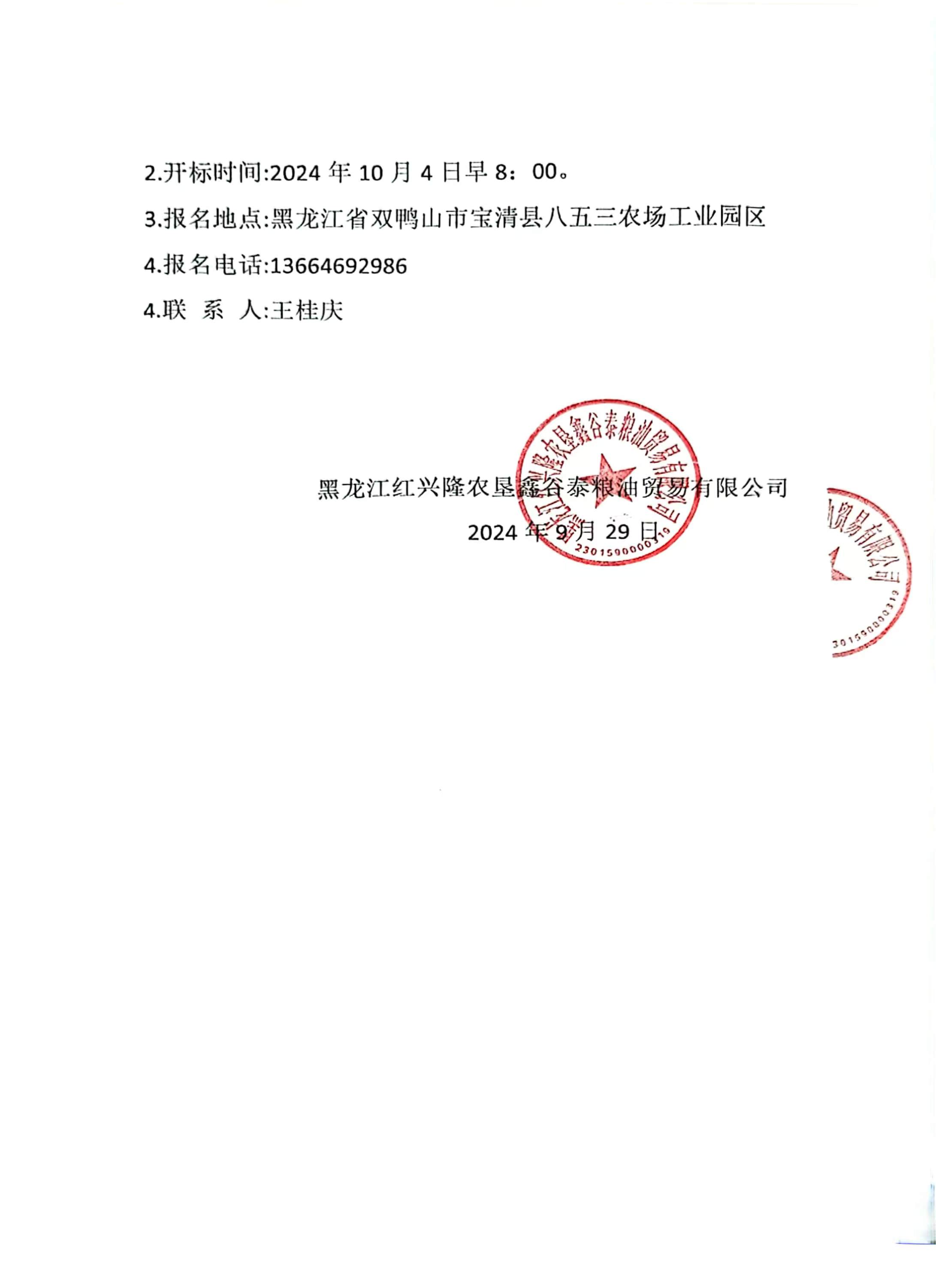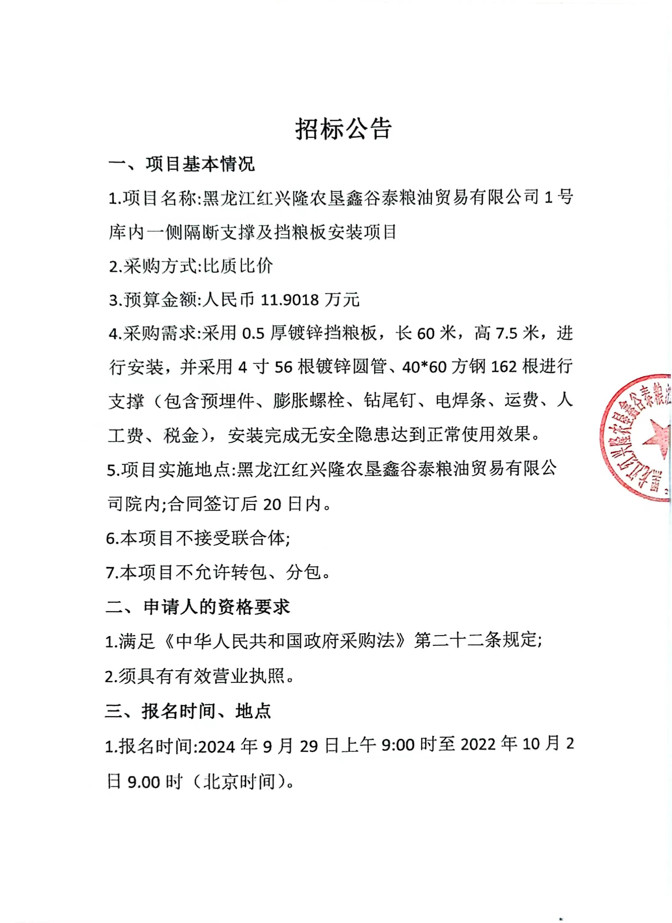 黑龍江紅興隆農(nóng)墾鑫谷泰糧油貿(mào)易有限公司1號庫內(nèi)一側(cè)隔斷支撐及擋糧板支撐及擋糧板安裝項目招標(biāo)公告