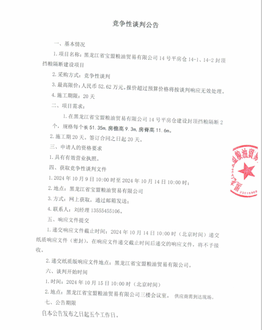 黑龍江省寶盟糧油貿(mào)易有限公司14號平房倉擋糧隔斷項目競爭性談判公告