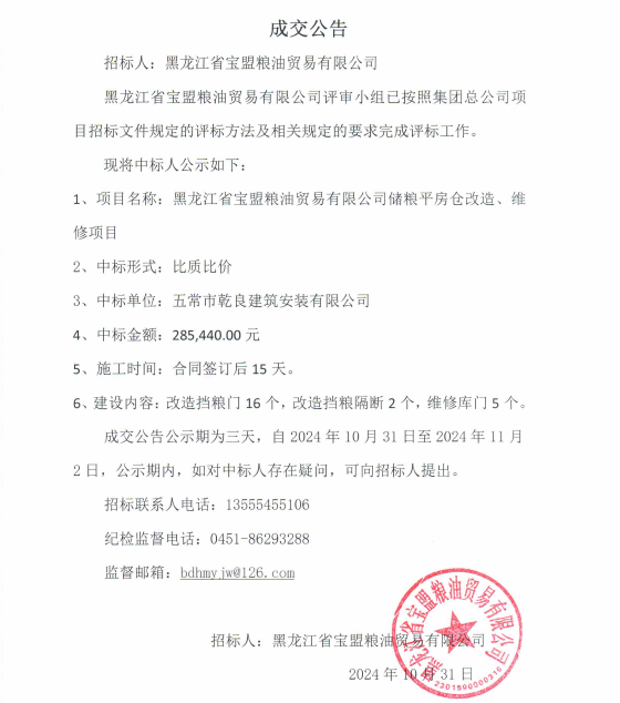 黑龍江省寶盟糧油貿(mào)易有限公司平房倉改造維修項(xiàng)目中標(biāo)公告