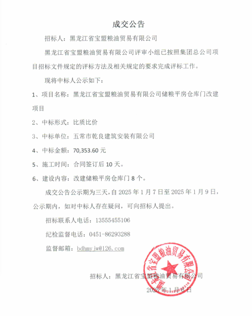 黑龍江省寶盟糧油貿(mào)易有限公司儲(chǔ)糧平房倉(cāng)倉(cāng)門(mén)改建項(xiàng)目中標(biāo)公告
