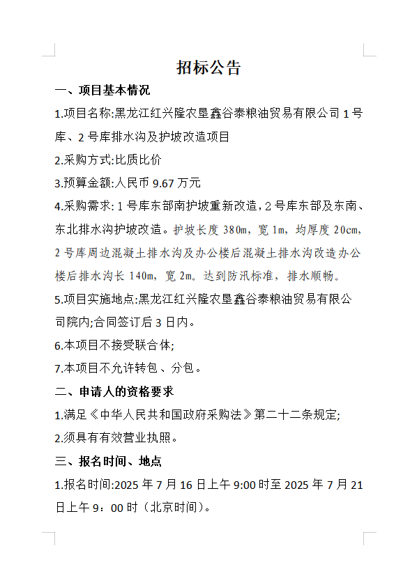黑龍江紅興隆農(nóng)墾鑫谷泰公司國儲糧1號、2號排水溝及護坡改造項目招標(biāo)公告