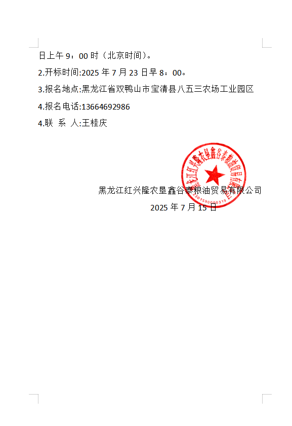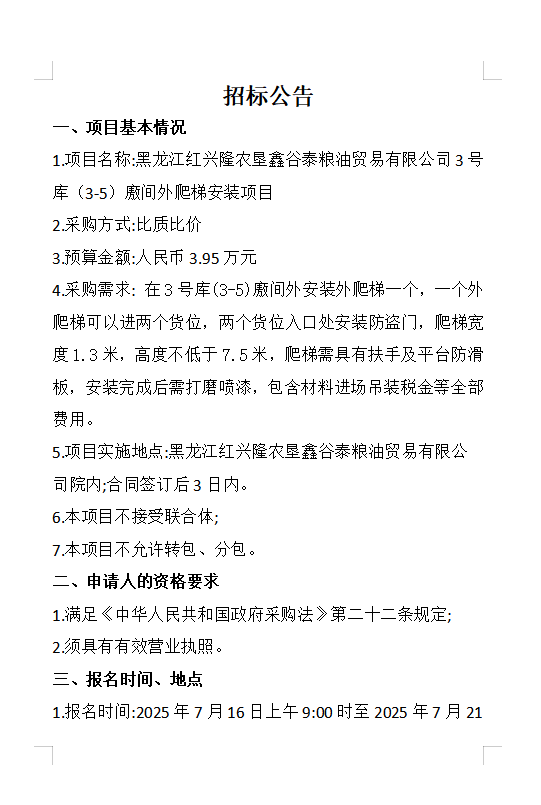 黑龍江紅興隆農(nóng)墾鑫谷泰公司國儲糧3號庫廒間外爬梯安裝項(xiàng)目招標(biāo)公告