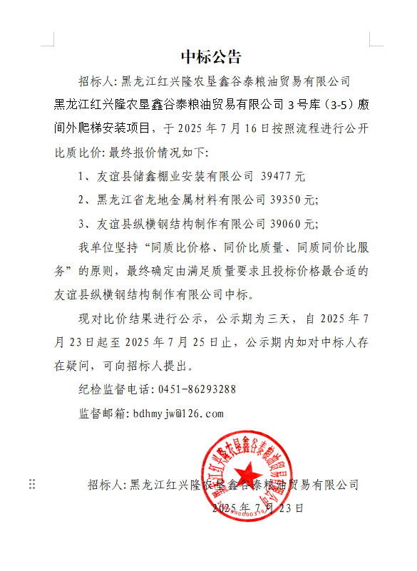 黑龍江紅興隆農(nóng)墾鑫谷泰糧油貿(mào)易有限公司3號庫(3-5)廒間外爬梯安裝項目中標公告