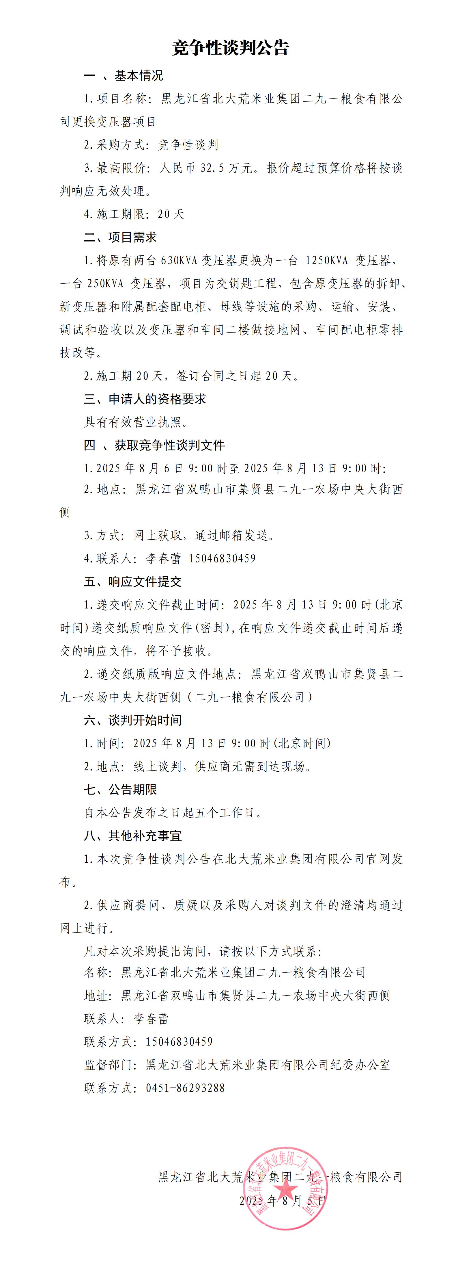 :黑龍江省北大荒米業(yè)集團(tuán)二九一糧食有限公司更換變壓器項(xiàng)目競爭性談判公告