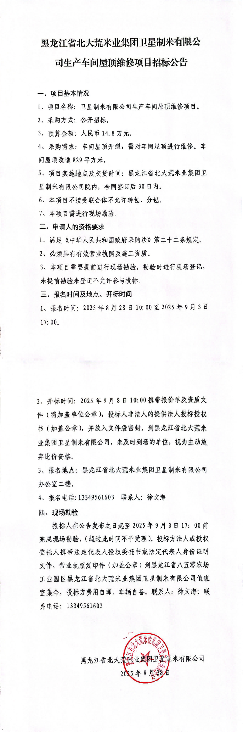 衛(wèi)星制米有限公司生產(chǎn)車間屋頂維修項(xiàng)目招標(biāo)
