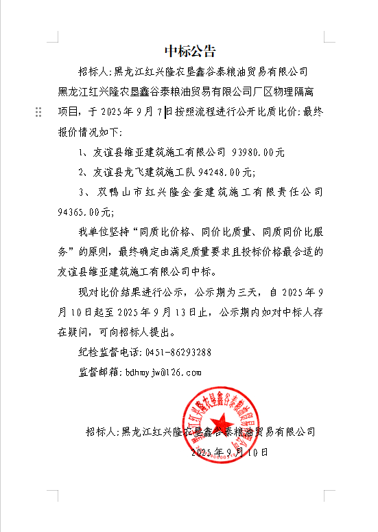 鑫谷泰糧油貿易有限公司廠區(qū)物理隔離項目中標公告