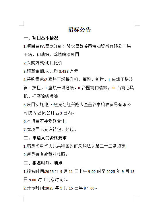 鑫谷泰糧油貿(mào)易有限公司烘干塔、初清篩、除銹噴漆項(xiàng)目招標(biāo)公告