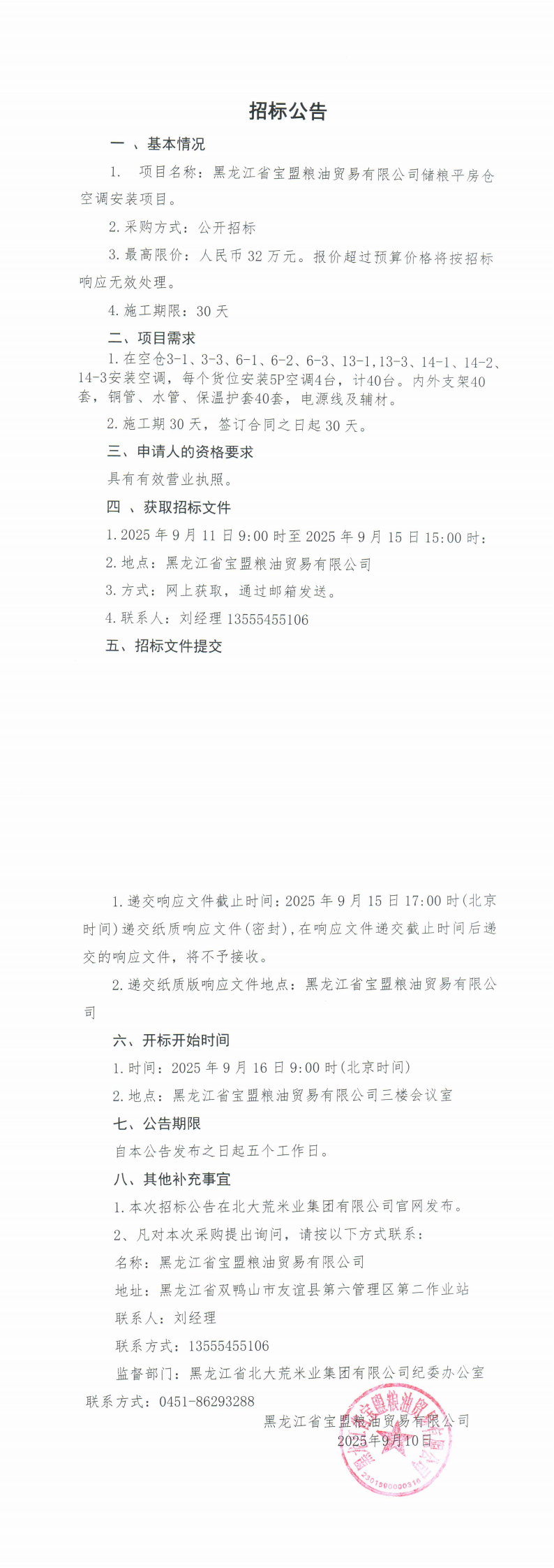 寶盟糧油貿(mào)易有限公司儲糧平房倉 空調(diào)安裝項(xiàng)目招標(biāo)公告