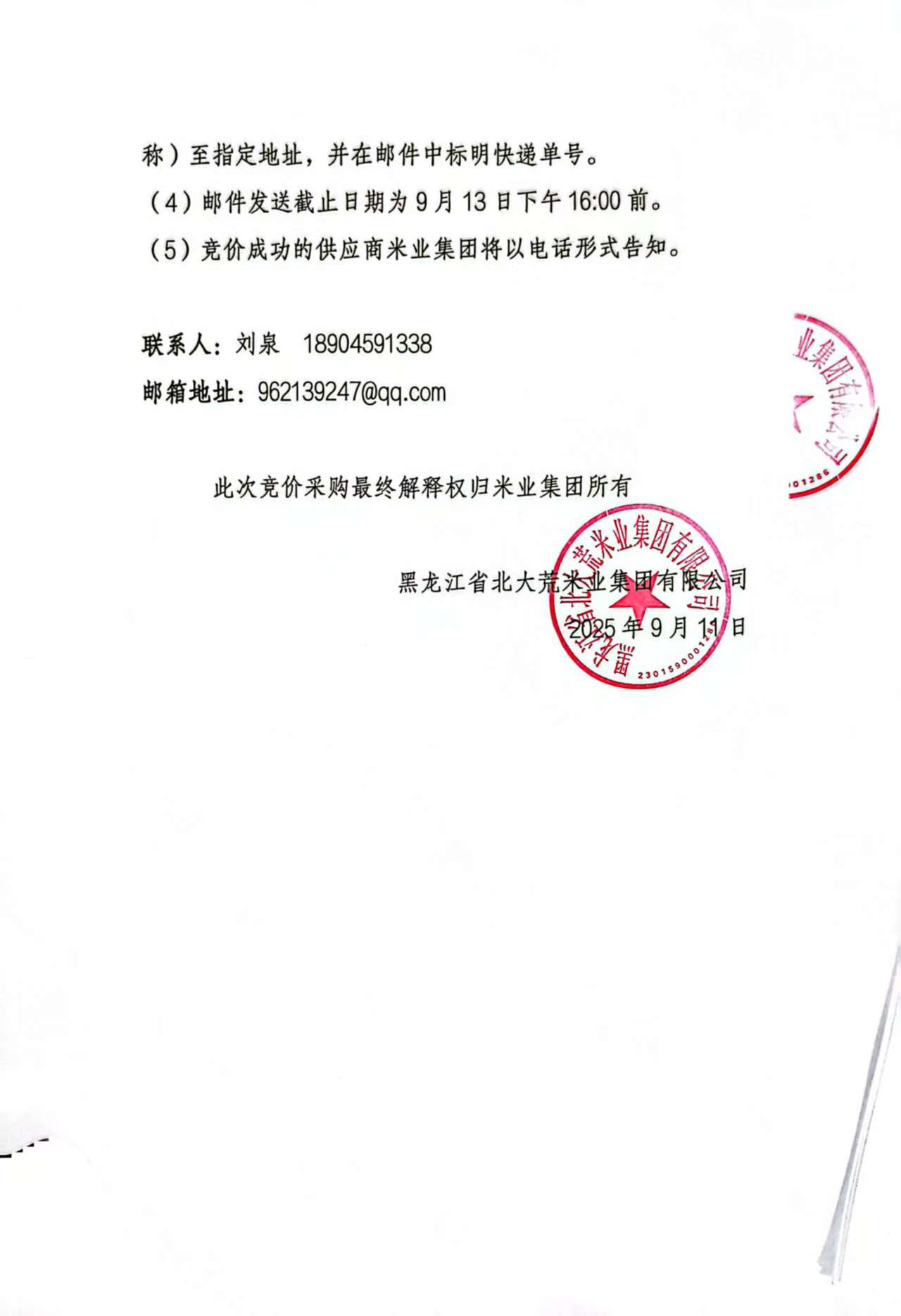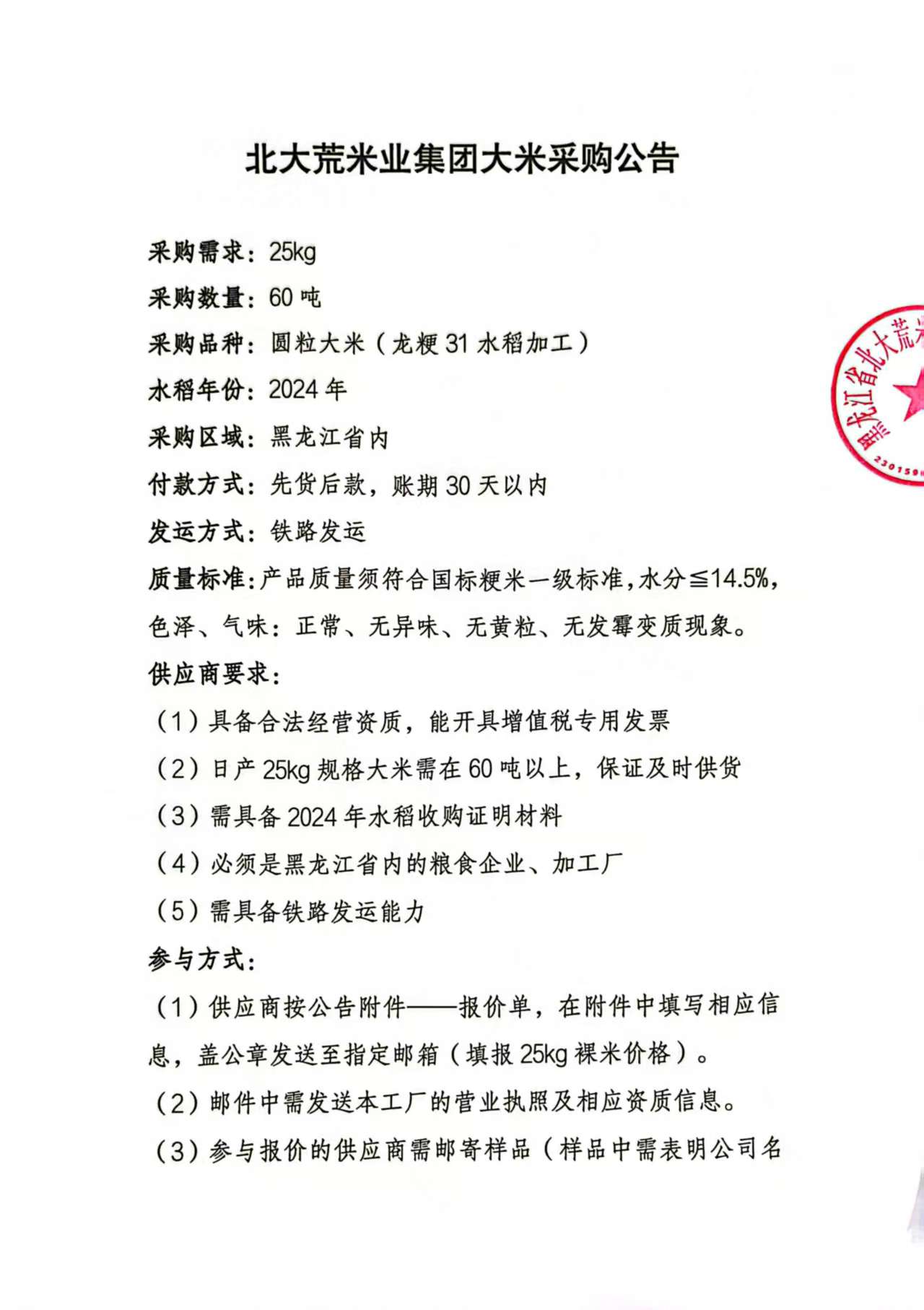 北大荒米業(yè)集團(tuán)大米采購公告