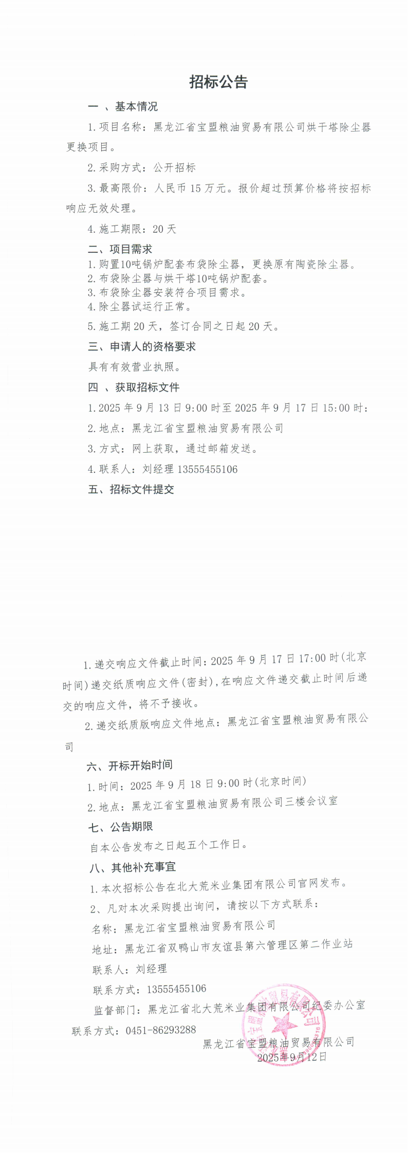 寶盟糧油貿(mào)易有限公司烘干塔除塵器更換項目招標公告