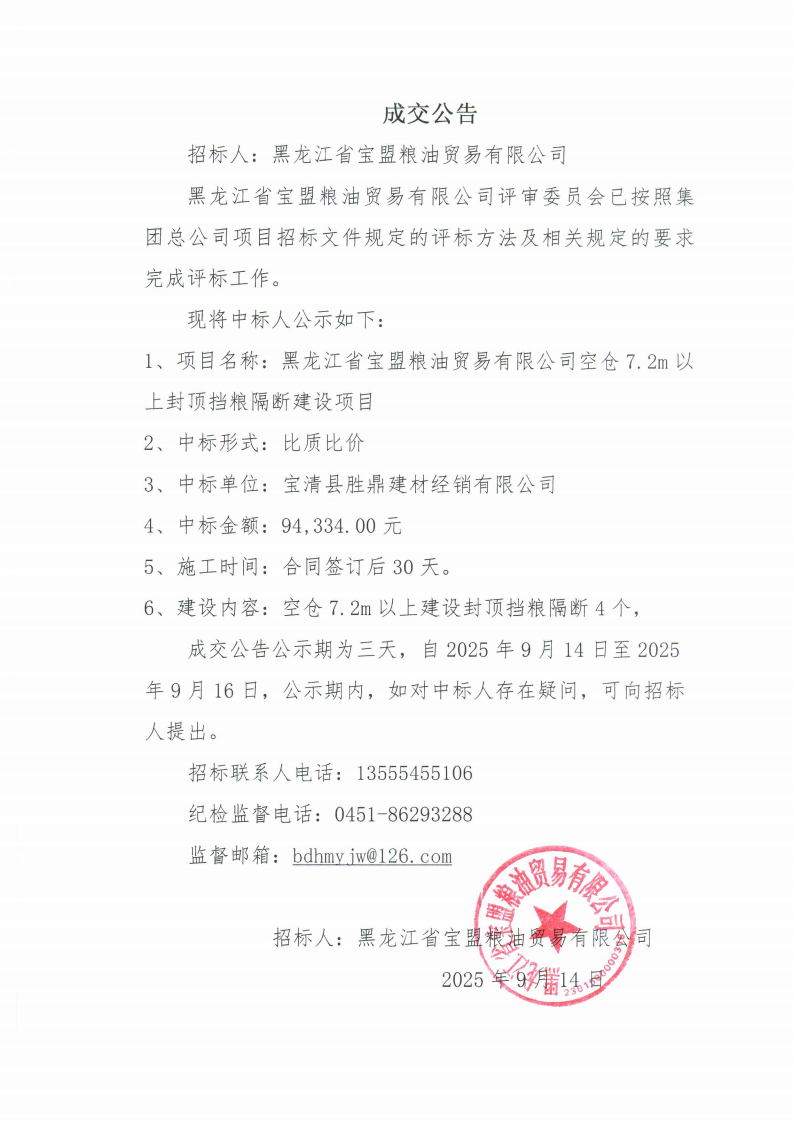 寶盟糧油貿(mào)易有限公司空倉7.2m以上封頂擋糧隔斷建設項目中標公告