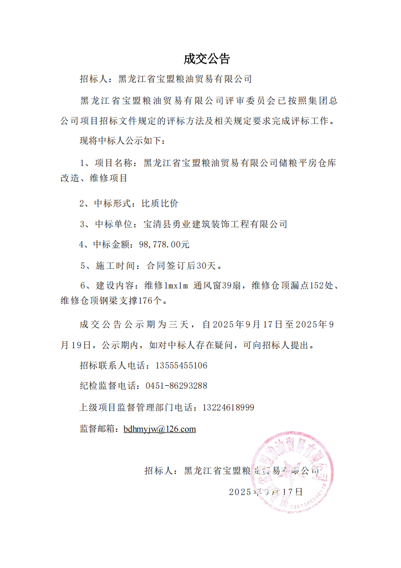 黑龍江省寶盟糧油貿(mào)易有限公司儲(chǔ)糧平房倉(cāng)庫(kù)改造、維修項(xiàng)目中標(biāo)公告