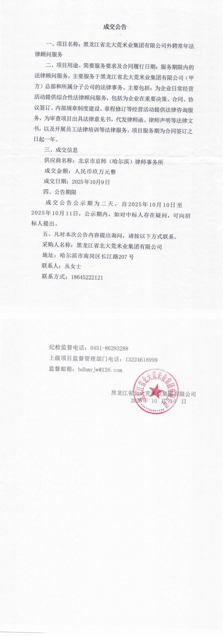 黑龍江省北大荒米業(yè)集團有限公司外聘常年法律顧問服務(wù)成交公告