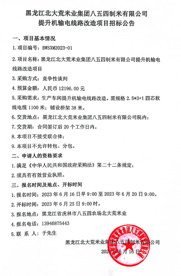 北大荒米業(yè)八五四公司提升機(jī)輸電線路改造招標(biāo)公告