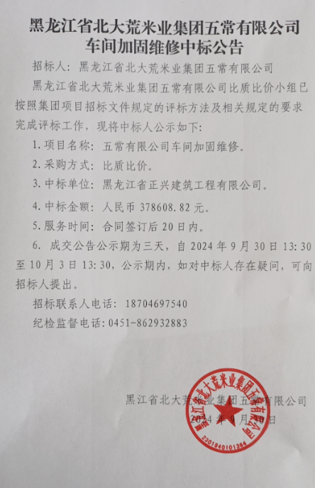 五常有限公司車(chē)間加固維修中標(biāo)公告