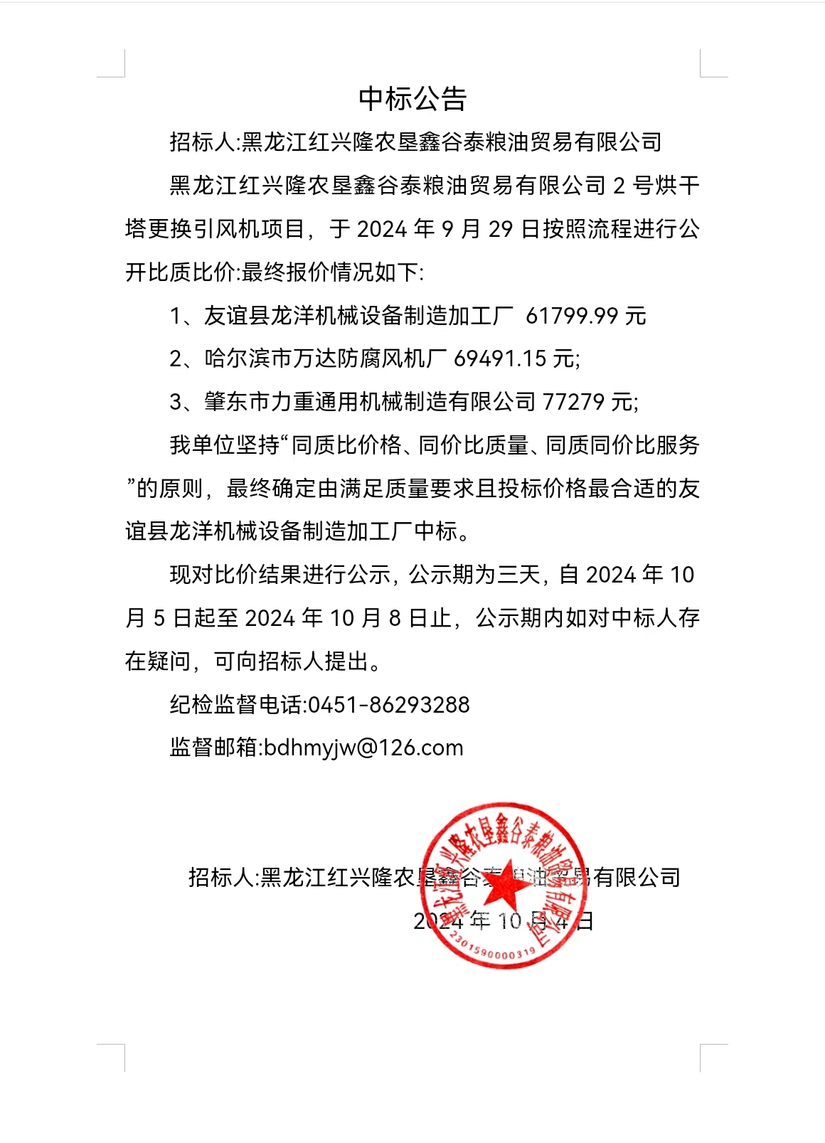 鑫谷泰糧油公司2號(hào)烘干塔更換引風(fēng)機(jī)項(xiàng)目中標(biāo)公告